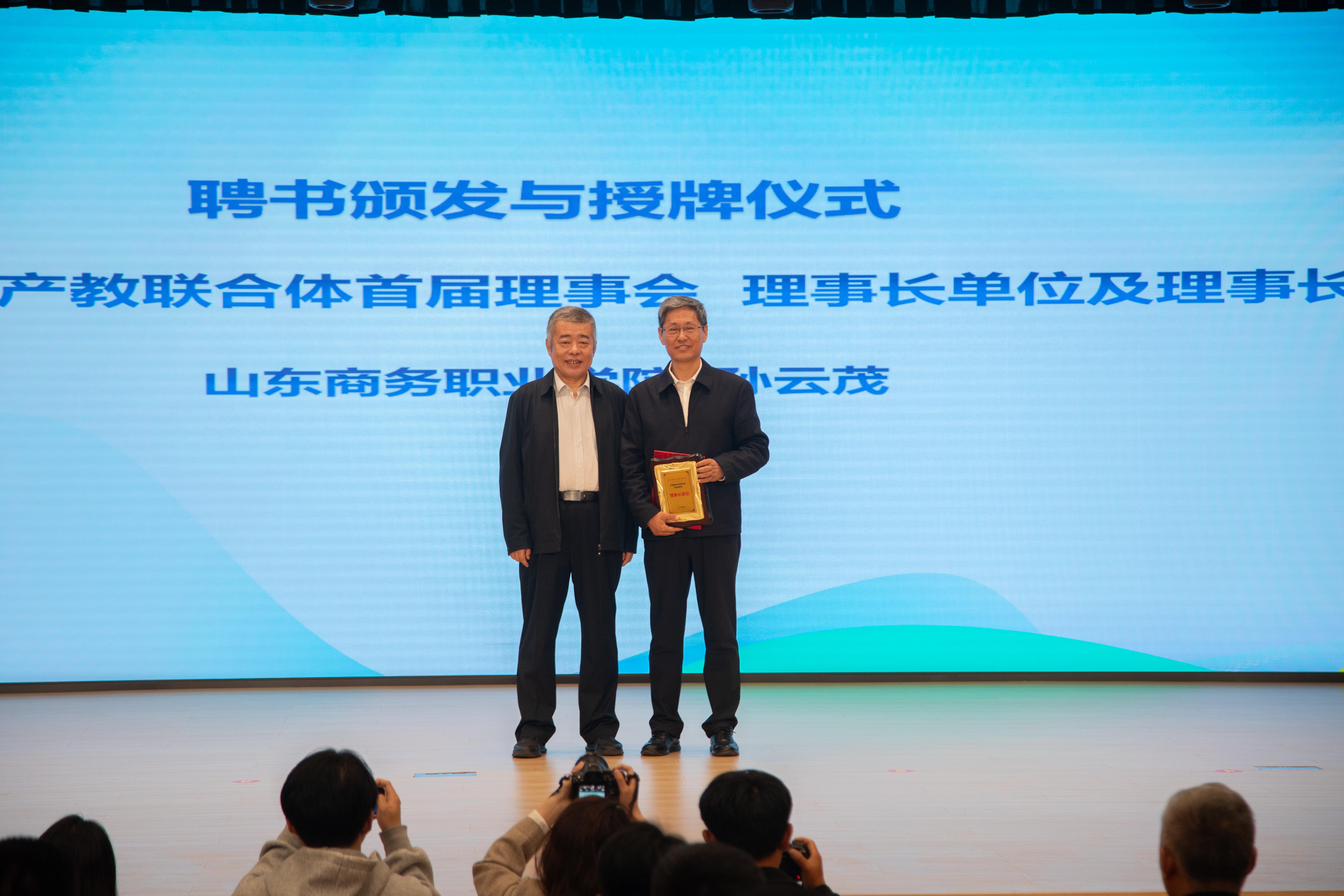 大会宣布了齐鲁粮油产教联合体首届理事会第一次选举结果并举行授牌与聘书颁发仪式。山东商务职业学院当选理事长单位兼秘书长单位,学校党委书记孙云茂任理事长,党委副书记张越任秘书长;山东省农业集团有限公司、滨州中裕食品有限公司、山东鲁花集团股份有限公司等6家单位当选副理事长单位;山东省粮油检测中心、山东农业大学等40家单位当选理事单位。邓俊庆为理事长单位及理事长授牌、颁发聘书;齐鲁粮油产教联合体首届理事会理事长孙云茂为副理事长单位及副理事长、秘书长授牌、颁发聘书。