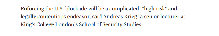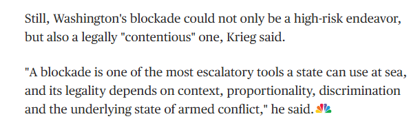 克里格在文章最后指出,美国发起的封锁不仅是一项“高风险”行动,在法律层面也 “颇具争议”。他表示:“封锁是国家在海上可以采取的最具挑衅性的手段之一,其合法性取决于具体情境、行动是否适度、是否具有针对性,以及是否存在武装冲突的潜在风险等因素。”