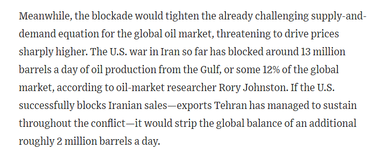 报道还提到,美国对霍尔木兹海峡的封锁还将进一步加剧全球石油市场本已严峻的供需失衡状况,有可能导致油价大幅飙升。石油市场研究机构罗里·约翰斯顿(Rory Johnston)称,截至目前,美国对伊朗的军事行动已致使海湾地区日均约 1300 万桶石油产能陷入停滞,约占全球市场的 12%。若美国成功阻断伊朗石油出口,全球将再减少日均约 200 万桶的供应量。