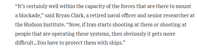 美国退役海军军官、哈德逊研究所(Hudson Institute)高级研究员布莱恩•克拉克(Bryan Clark)就指出,“当地的军事力量完全有能力实施封锁行动,这一点毫无疑问”,但如果伊朗开始向美军开火,情况就会变得更加棘手,此时美军就必须动用舰船提供防护。