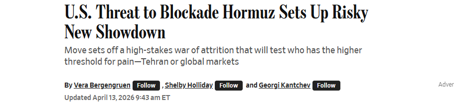 《华尔街日报》13日发表题为《美国威胁封锁霍尔木兹海峡将引发一场危险的新对决》的报道。报道指出,特朗普宣布美国军方对霍尔木兹海峡实施封锁,这引发了一场充满风险的新一轮对峙,可能会使美军陷入一场长期的管控博弈,以控制这一具有战略意义的关键航道,同时加剧这场冲突对全球经济造成的损害。