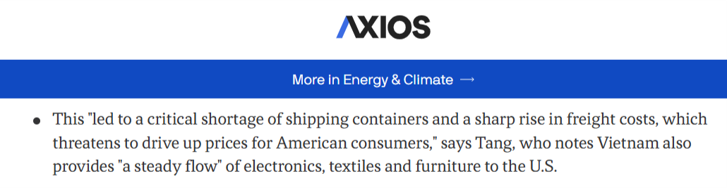 越南是美国最大的服装供应国。受能源短缺影响,越南已被迫采取紧急措施,包括大幅增加燃煤发电量,并敦促民众居家办公。报道称,越南约80%至85%的石油从中东进口。由于战争影响,船只被迫绕行好望角,导致运输成本增加了30%至50%,“这导致了海运集装箱的严重短缺以及运费的急剧上涨,可能推高美国消费者的物价。”报道指出,除了纺织品,越南还是美国电子产品与家具的重要供应商。