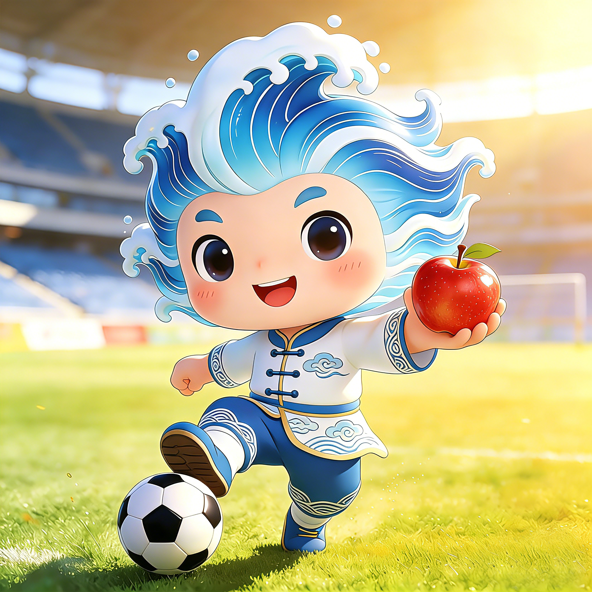 最最最可爱的吉祥物“烟小浪”来啦!这小家伙,一头蓝白相间的浪花发型,手里拿着红苹果(是不是想咬一口),脚下还踩着足球,简直是萌态可掬,让人爱不释手!“烟小浪”不仅代表了烟台的海浪文化,还寓意着足球赛事的欢乐与激情。有了它,烟台足球的赛场,必将更加热闹非凡。