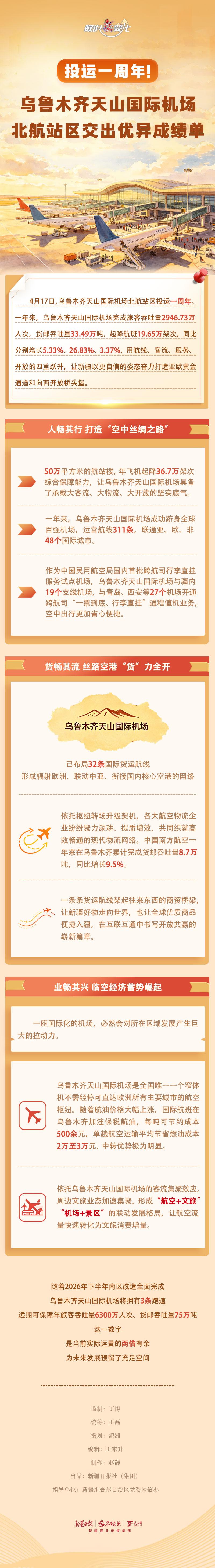 4月17日,乌鲁木齐天山国际机场北航站区投运一周年。一年来,乌鲁木齐天山国际机场完成旅客吞吐量2946.73万人次,货邮吞吐量33.49万吨,起降航班19.65万架次,同比分别增长5.33%、26.83%、3.37%。一年来,这座4F级现代化空港如何用航线、客流、服务、开放的四重跃升振翅翱翔?今天的《数说“新”变化》一起来看看。