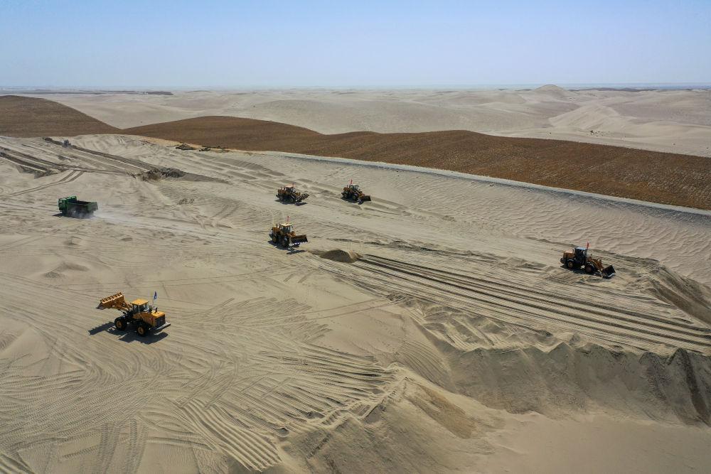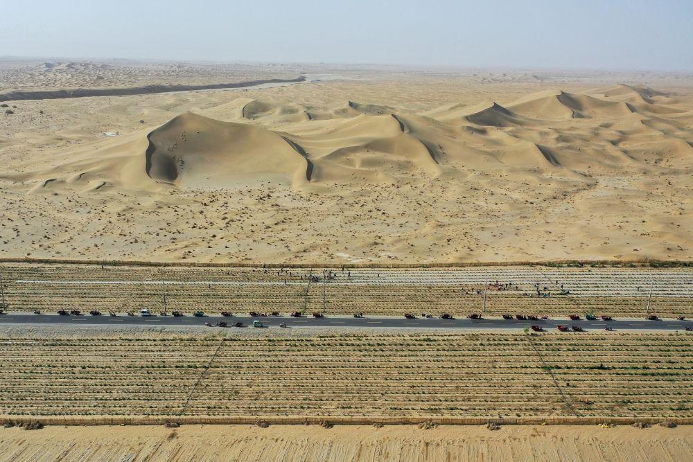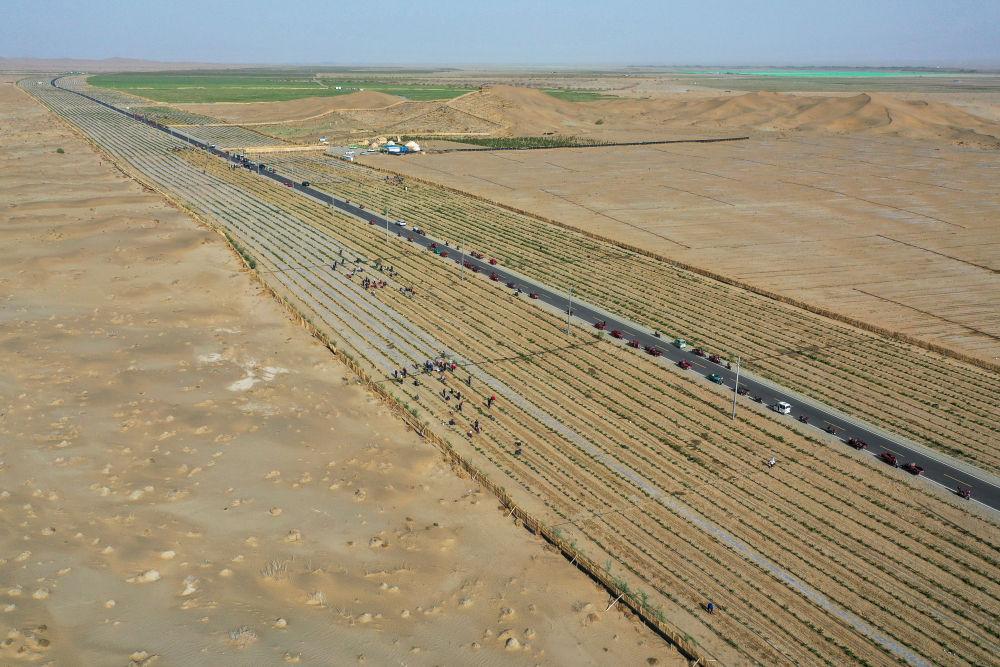 眼下,新疆塔克拉玛干沙漠南缘一派繁忙景象。人们平整沙丘、铺设草方格、嫁接苗木、栽种中药材……塔克拉玛干沙漠边缘治沙正酣。