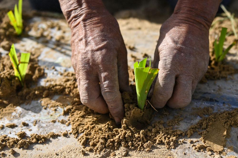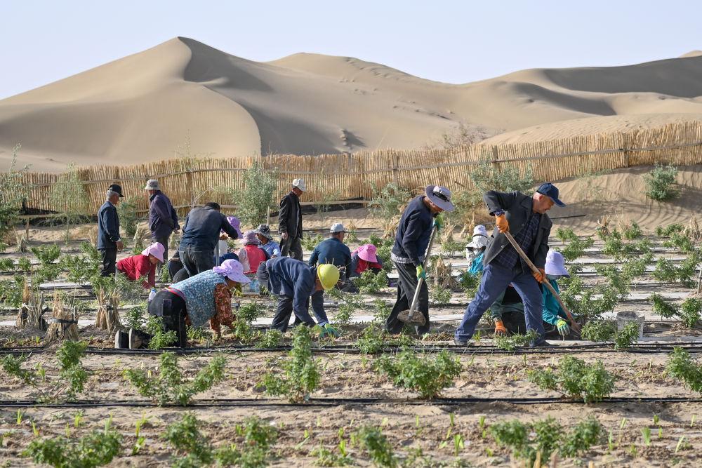 在新疆和田地区于田县万花园防沙治沙示范区,村民栽种中药材射干(4月15日摄)。 新华社记者 丁磊 摄