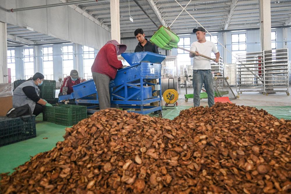 在新疆阿克苏鑫奕泽农业科技有限公司,工人在分拣肉苁蓉切片(4月14日摄)。 新华社记者 丁磊 摄