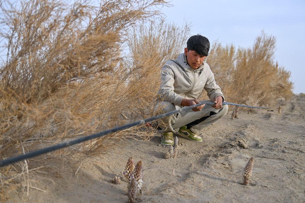 在位于新疆阿克苏地区沙雅县的新疆仙草蓉科技有限公司防沙治沙荒漠植物示范园,工作人员在检查滴灌带(4月13日摄)。 新华社记者 丁磊 摄