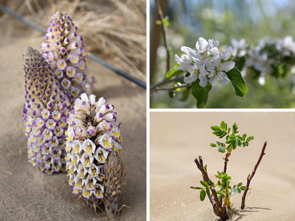 拼版照片:右上为在新疆阿克苏市丰庆园农民专业合作社示范园拍摄的苹果花(4月14日摄);右下为在新疆和田地区于田县阗东防沙治沙示范区拍摄的玫瑰花苗(4月15日摄);左为在新疆仙草蓉科技有限公司防沙治沙荒漠植物示范园拍摄的肉苁蓉(4月13日摄)。 新华社记者 丁磊 摄