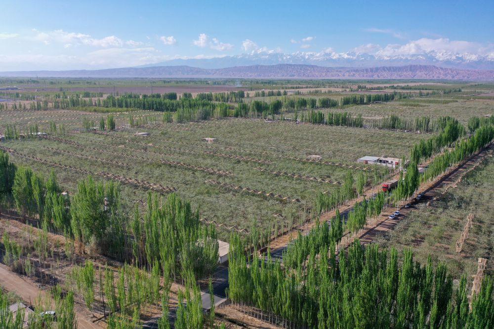 这是新疆喀什地区麦盖提县防风固沙生态林(4月17日摄,无人机照片)。 新华社记者 丁磊 摄