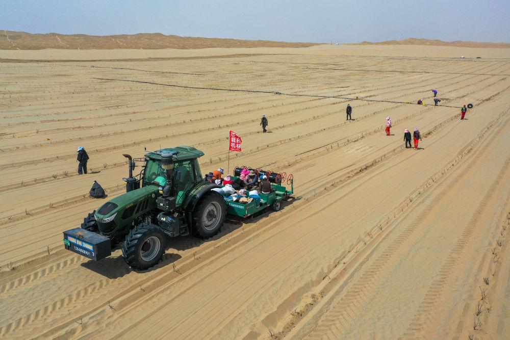 在新疆和田地区于田县阗东防沙治沙示范区,村民驾驶机械移栽玫瑰和黄芩,并铺设滴灌带(4月15日摄)。 新华社记者 丁磊 摄