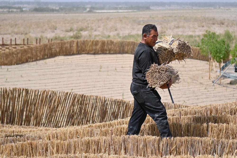 在新疆和田地区于田县阗东防沙治沙示范区,村民搬运制作草方格的芦苇(4月15日摄)。 新华社记者 丁磊 摄