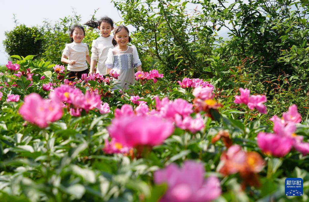 4月19日,游客在湖南省祁东县白地市镇的芍药种植基地打卡游玩。