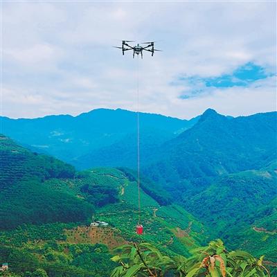 云南红河哈尼族彝族自治州河口瑶族自治县老范寨乡无人机正在运送芒果。