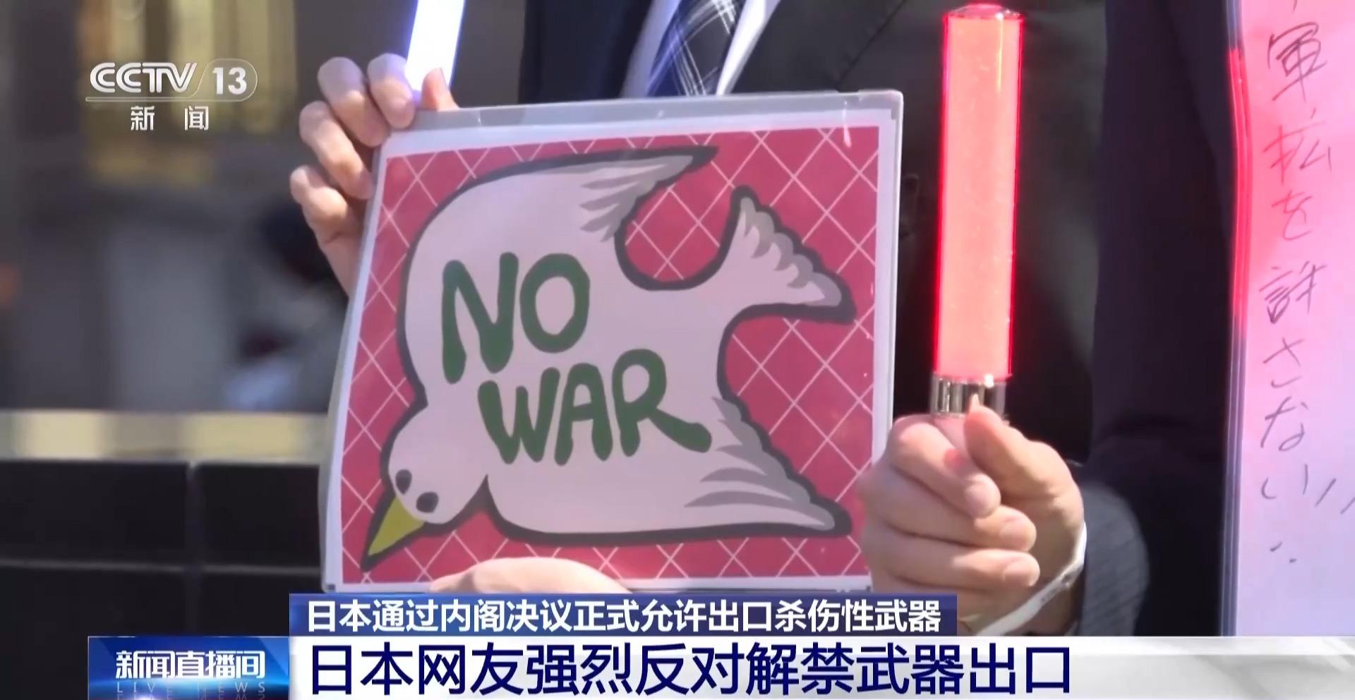 总台记者 李卫兵:在社交媒体上,日本网友也表达了对日本解禁武器出口的强烈反对,有网友称,“通过杀人来赚钱的日本还有什么夸耀可言,绝不能容忍。不能允许不通过国会肆意作出这样的决定”“杀伤性武器出口问题相当于修宪级别的‘国策’变更”。有网友发出疑问,目前这是以内阁会议方式决定的,至少也需要在国会进行审议,这个决策过程难道没有问题吗?