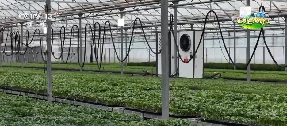 除了播种,在育苗管理上也有很多科技手段。俗话说:植物生长靠太阳。大棚里架子上挂着的补光灯,它和日常家庭使用的灯光不同,能够更好地模拟自然光照的状态,通过增加光照促进蔬菜种苗的生长。在大棚里有自动喷淋的水肥一体化系统,能够将科学配比好的肥水定时定量喷洒在苗床上。除此之外,这座育苗基地里还使用了新式温控系统,过去像这样的农业大棚里,要保持恒温恒湿,通常会烧锅炉,不仅不环保,还有安全隐患。现在的育苗基地使用10—15摄氏度的地下水作为温控核心,能够做到在夏天给大棚降温,在冬天又能保持一定温度,从而保障了育苗基地一年四季的正常生产。