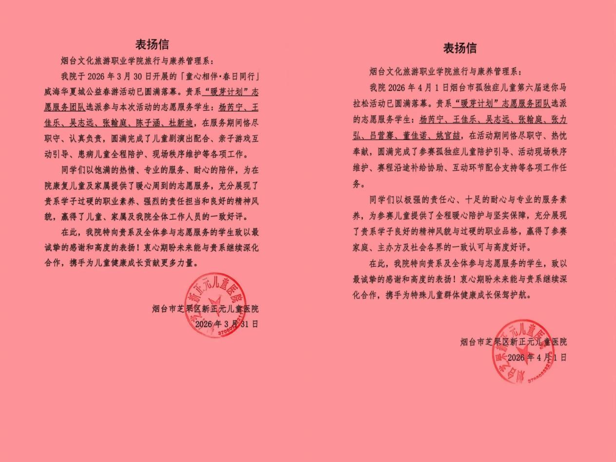 烟台市新正元儿童医院为旅行与康养管理系发来两封表扬信,高度评价“暖芽计划”志愿服务团队的公益服务。信中提到,在威海华夏城公益游中,6名志愿者圆满完成儿童陪护、亲子游戏引导、秩序维护等工作;在迷你马拉松赛事里,8名志愿者高效完成参赛儿童陪护、现场秩序维护、赛程补给协助等任务。志愿者们以饱满热情、专业服务和细致耐心,展现了学院学子的职业素养与责任担当,赢得各方一致好评,医院还表达了深化合作的期盼。