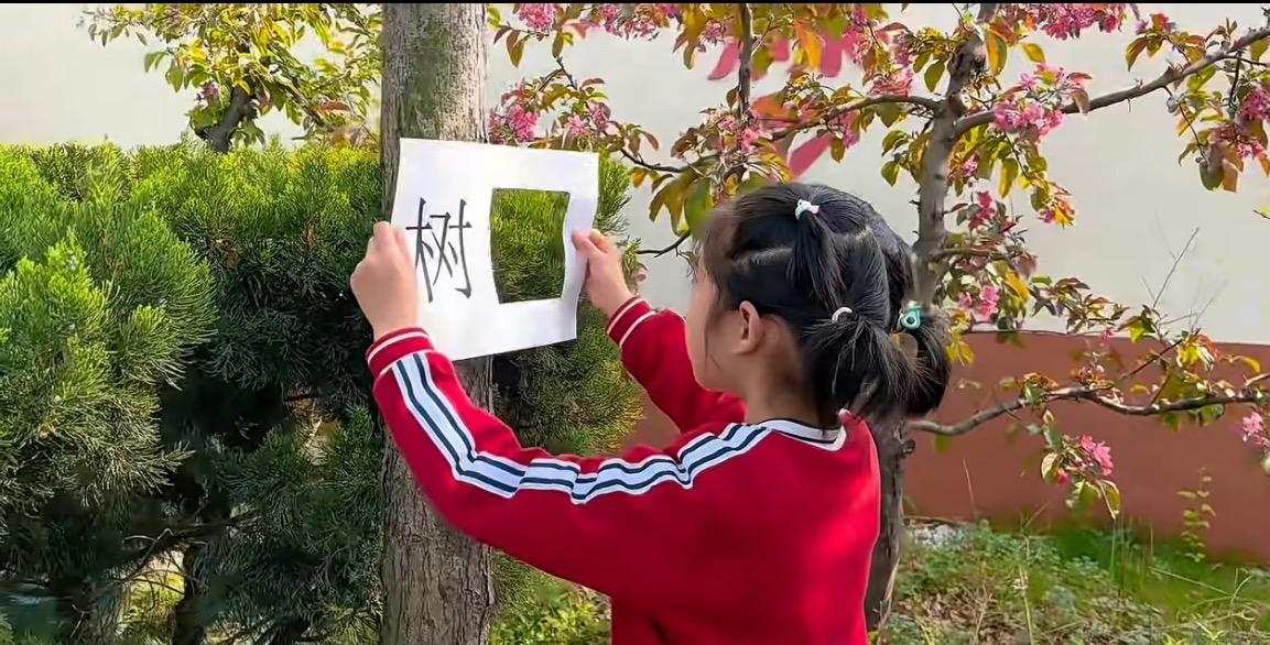 活动中,老师们巧妙将识字教学与春日风光结合,孩子们手持汉字卡片,在花草树木间寻找对应实景,把抽象的文字与真实的景物一一对应。照片中的小朋友正拿着“树”字卡片,对照着眼前的松柏,在直观互动中加深对汉字的理解与记忆。春日里繁花盛放、草木葱茏,孩子们一边认读汉字,一边观察自然万物,在轻松愉快的氛围里完成了识字启蒙,也感受着春天的生机与美好。