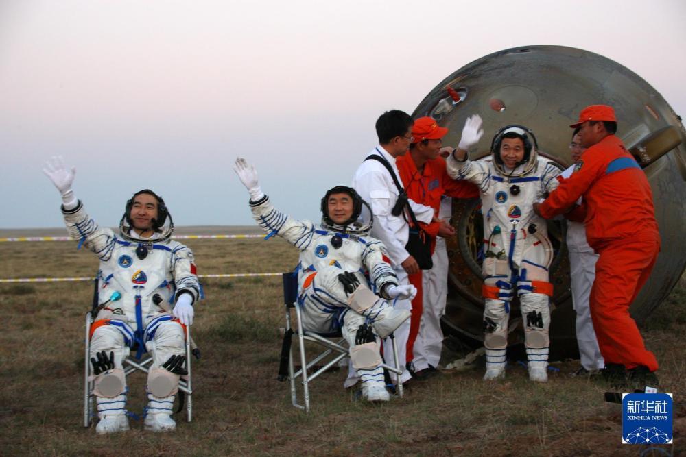 2008年9月28日,神舟七号返回地球,航天员翟志刚、刘伯明、景海鹏(从左至右)自主出舱后向现场搜救人员挥手致意。 新华社记者 王建民 摄2011年
