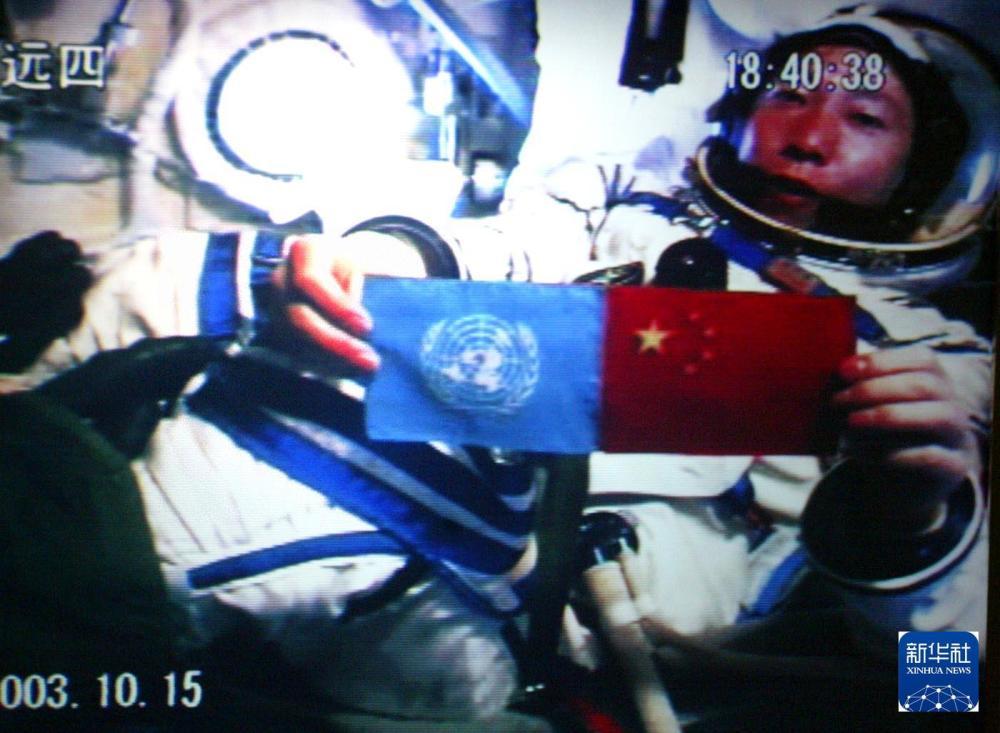 2003年10月15日18时40分,航天员杨利伟从太空向世界各国人民问好,并在舱内并列展示了五星红旗和联合国旗(摄于北京航天指挥控制中心大屏幕)。新华社发2005年10月12日至17日