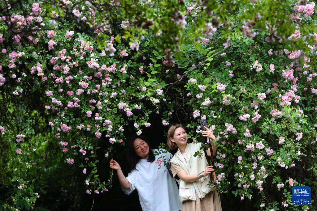 4月27日,游客在重庆市黔江区阿蓬江国家湿地公园花卉园赏花、游玩。