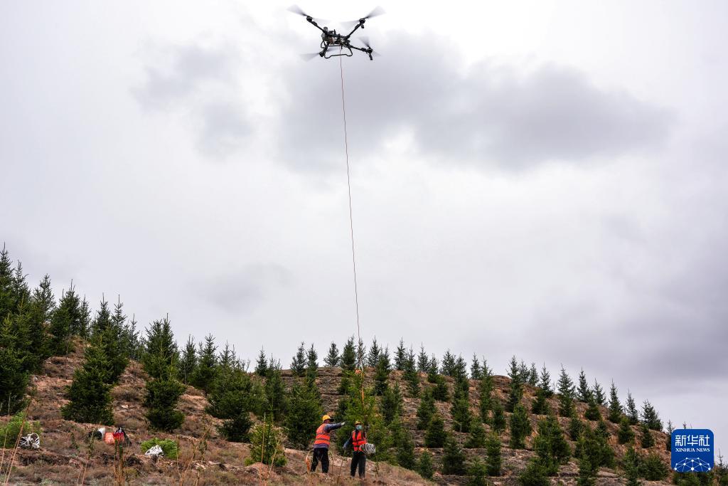 连日来,在兰州新区南部郊野公园2300余亩荒山坡地上,数架植保无人机来回穿梭,精准将苗木吊运至山坡各植树点位,高效助力造林作业。